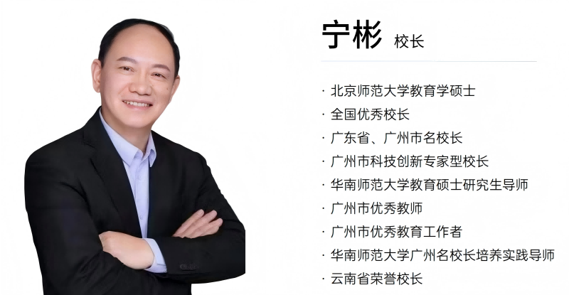 学校聘请了原广州外国语学校复办创校校长、全国优秀校长、广东省及广州市名校长宁彬担任首任校长,以精细化管理、精准化教学、精到化服务于在校每一位学生,全力确保学生享受到高精尖的师资和高品质的教育教学及管理服务。宁彬校长拥有37年的公、民办学校办学管理实践,在学校筹建、市场招生、办学运营、质量提升与品牌打造方面积累了深厚的实战经验。37年来,培养了一大批清华、北大、985、211和美国常青藤、英国G5等国际一流大学学子。