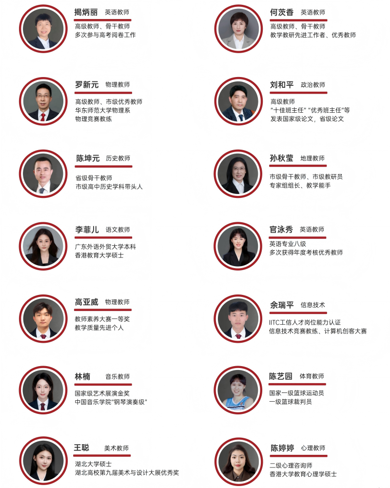 学校同时精心打造了一支由两院院士、清北创新人才培养专家教授领衔、奥赛金牌教练、特级教师、正高级教师与高级教师、省市级骨干名师组成的师德优秀、经验丰富、结构合理、充满激情的师资队伍,并特别聘请了原广州外国语学校创校校长、全国优秀校长、广东省及广州市名校长宁彬同志担任首任校长,以精细化管理、精准化教学、精到化服务于在校每一位学生,全力确保学生享受到高精尖的师资和高品质的教育教学及管理服务。