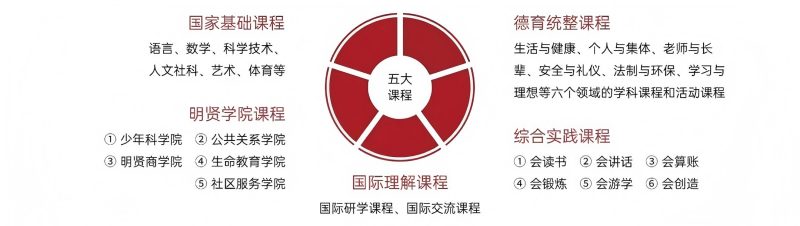 明贤学院课程:少年科学院(科创)、商学院(财商)、生命教育学院(心理健康)等五大分院,提供大量选修模块。