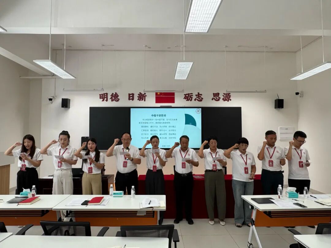在中层干部宣誓环节,全体中层干部右手握拳,郑重承诺敢于担当、忠于职守、率先垂范、服从领导。紧接着进行教职员工宣誓仪式,由吴帆老师、孙秋莹老师领誓,全体教职员工表达了忠诚教育事业、服务学生成长的坚定决心。