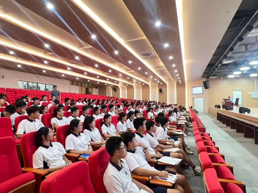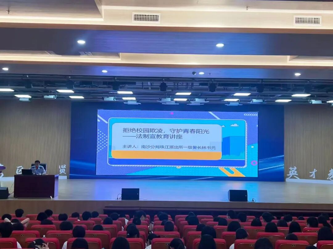 夜幕初垂,报告厅内灯火通明。2025年9月11日晚19:00,广州市明贤实验高级中学高一年级全体学子齐聚于此,一场以“拒绝校园欺凌,守护青春阳光”为主题的法制宣传教育讲座如期举行。本次活动特邀教育局委派的法制副校长林书元(南沙分局珠江派出所一级警长)主讲,宁彬校长、何茨香老师及高一年级全体班主任、晚自习任课教师共同参与,以法治为笔,为青春写下温暖的守护篇章。