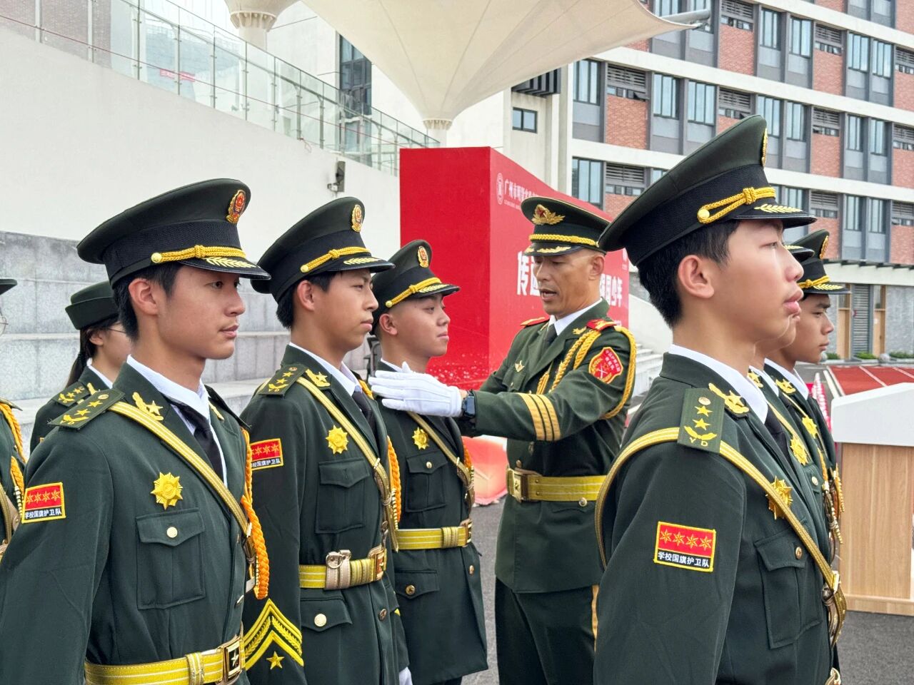 活动伊始,原天安门国旗护卫队退役官兵王念江队长对学校国旗班学生开展升旗仪式规范化训练,从动作衔接到流程细节逐一指导。训练结束后,升旗仪式正式举行,王念江队长与学校国旗班联合执旗,全体嘉宾、师生肃立高唱国歌,现场氛围庄重。