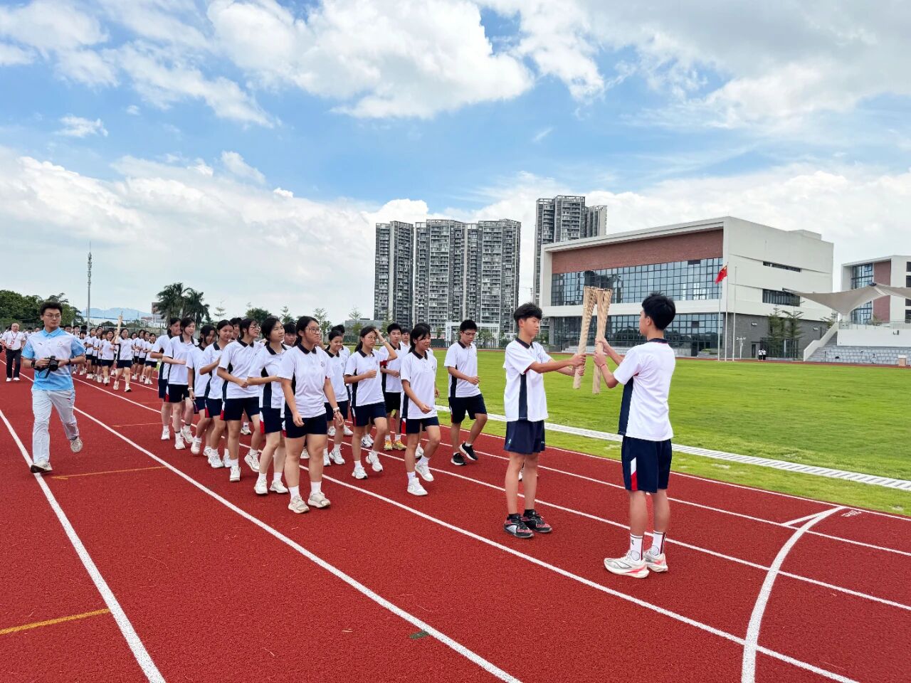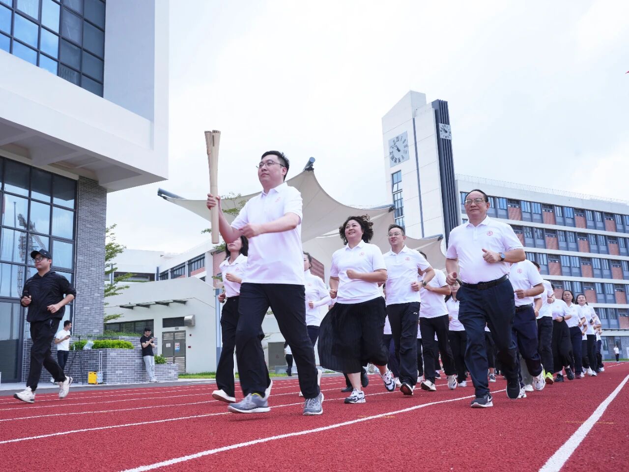 紧接着,火炬传递环节启动。胡伟京组长将火炬授予师生代表,火炬手接力传递,他们矫健的步伐、高擎的火炬,汇聚了全校师生的目光。沿途学生举旗呐喊“火炬传递,青春担当”“薪火永燃,家国同心”的口号,传递体育精神与青春活力,现场气氛热烈,激动人心。