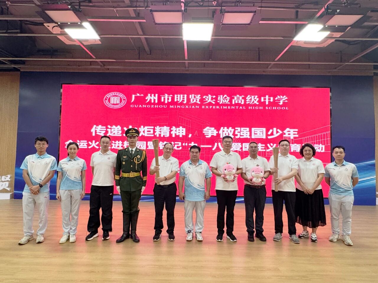 十五运会和残特奥会广东赛区执委会火炬传递专家组组长胡伟京,广州市南沙区珠江街道办事处党工委书记赵伟,广州南沙开发建设集团副总经理王明军,广东护旗兵教育基地王念江队长等特邀嘉宾,与明贤高中全校师生共同参加了活动。