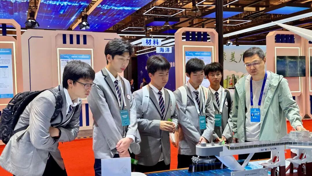 南沙国际会展中心内,我校五名高一学子在中国科学院展会的波风光储一体化能源平台项目模型前认真听讲。作为今年9月刚入学的首届明贤学子,他们此刻正站在学校发展的崭新起点上,亲历大湾区科技浪潮,开启一段意义非凡的成长新程。
