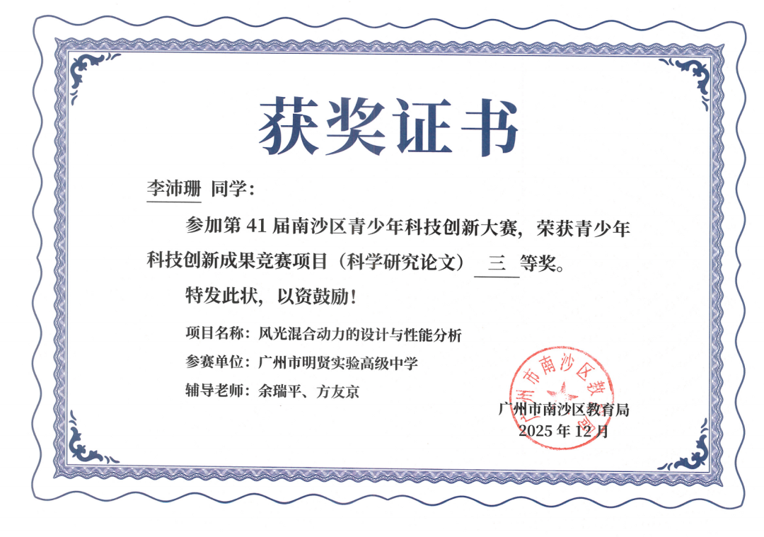 在第41届南沙区青少年科技创新大赛中,我校学子积极参与、勇于创新,其中高一(3)班李沛珊同学凭借扎实的研究、创新的思维和严谨的态度,荣获青少年科技创新成果竞赛项目(科学研究论文)三等奖,展现了出色的科学素养与实践能力!