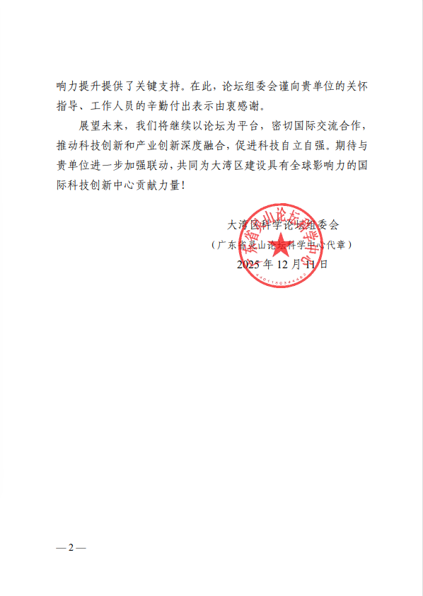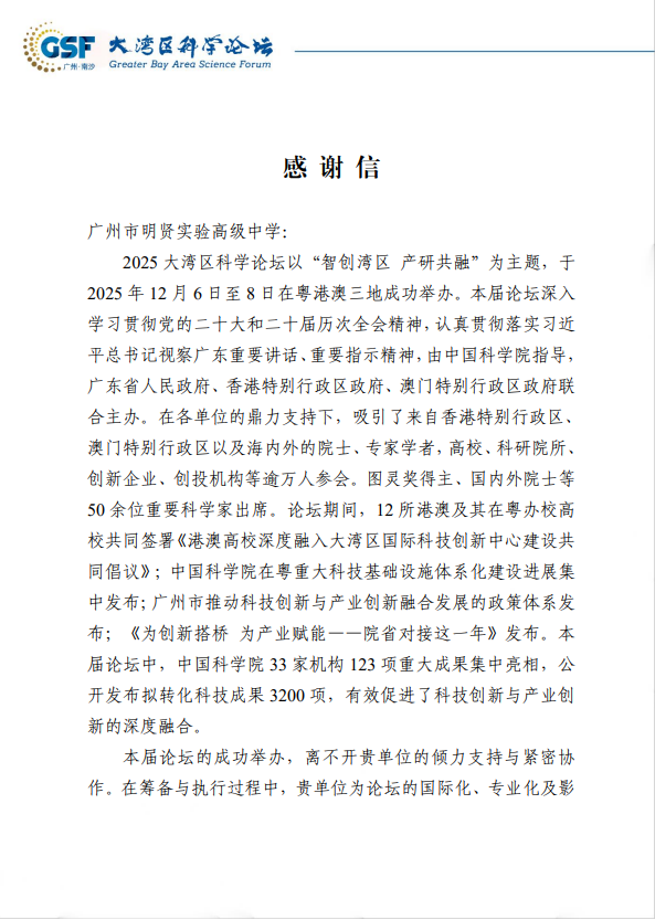 大湾区科学论坛组委会致我校的感谢信